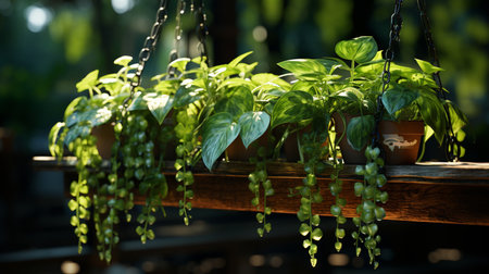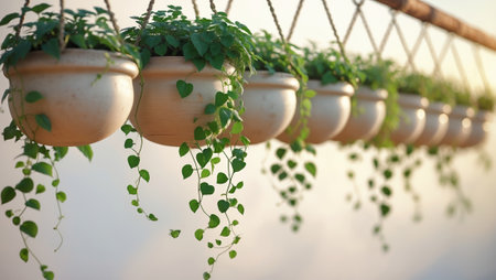 Hanging pots filled with vibrant green plants in a sunny outdoor space