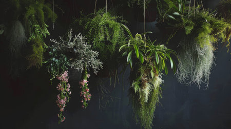 Lush Hanging Plants on Dark Background Featuring Various Greenery and Flowers