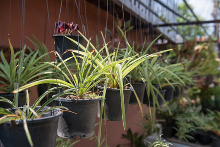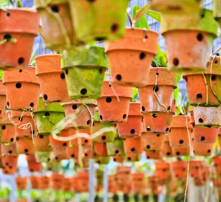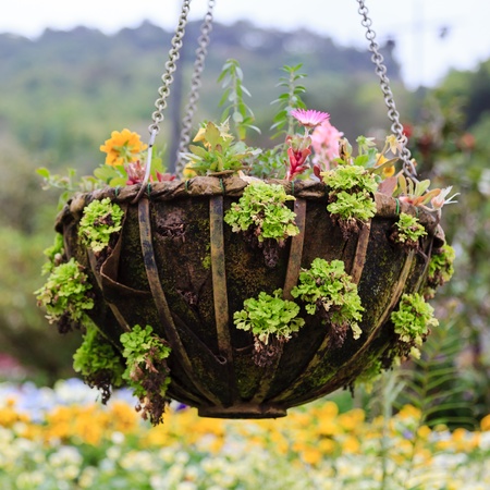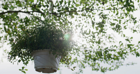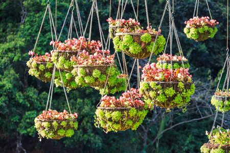 Tree plant on hanging flower pots on a backyard garden in Thailand