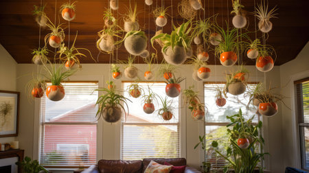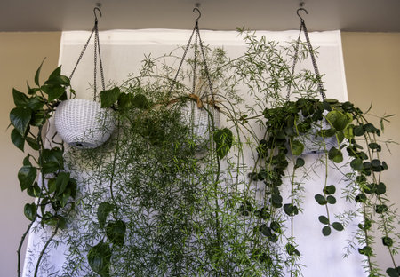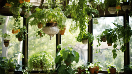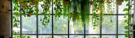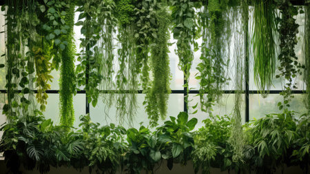Lush and verdant hanging plants forming a natural curtain in front of a large picture window creating a tranquil and serene indoor environment