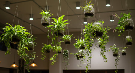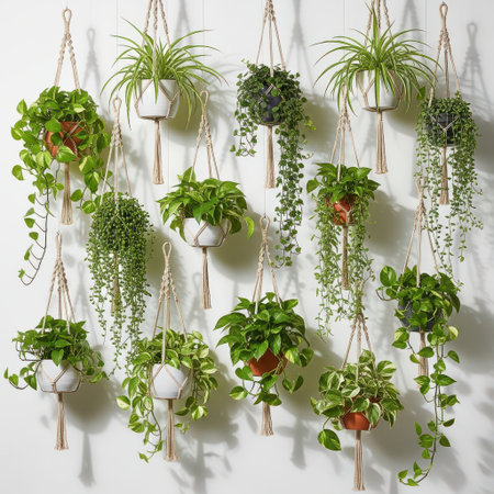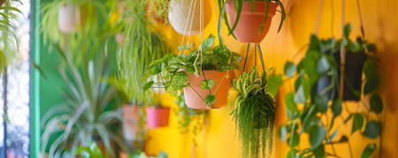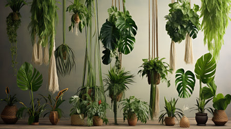 A stunning display of assorted hanging indoor plants in beautiful decorative pots, enhancing the natural aesthetic of any living space with serenity and charm.