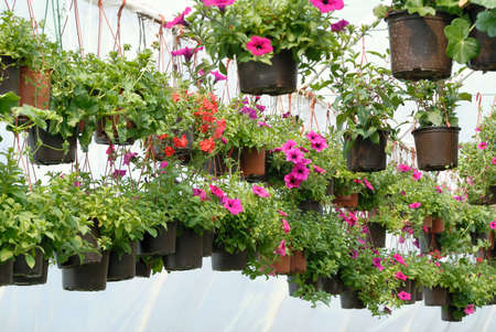 Petunia in hanging pots in a greenhouse. Pink, yellow and purple petunia flowers hang in plastic pots in a nursery.