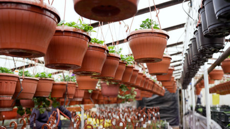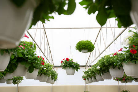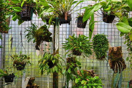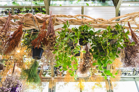 Greenhouse with plants hanging from the ceiling and lots of vegetation. Copyspace. Selective focus.