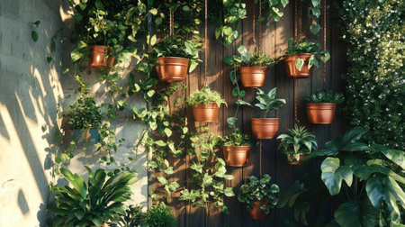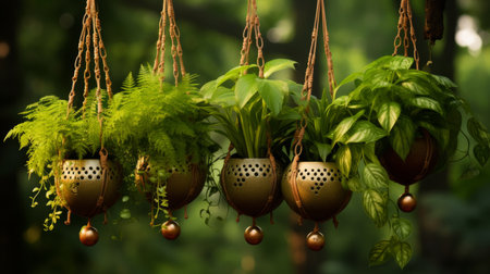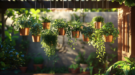 A stunning arrangement of lush greenery in hanging copper pots creates a serene ambiance in a beautiful garden, enhancing the aesthetic appeal while promoting tranquility.