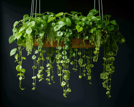 Modern black metal wall with cascading golden pothos and pearl plants for elegant decor