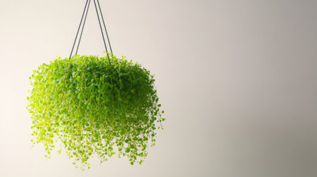 This image features a vibrant green hanging plant adorned with raindrops, set against a soft misty backdrop. The serene scene captures nature's tranquility, making it ideal for wellness or gardening themes.