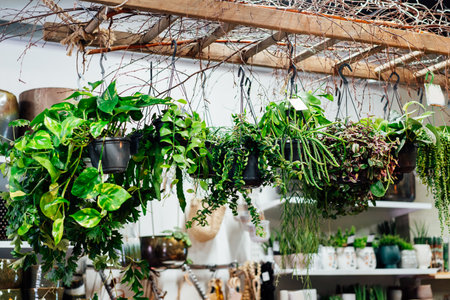 Various hanging house plants in the flower pots. Business of flower shop. Trendy interior flowers and home design in small plant store. Biophilia concept background. Selective focus, copy space.