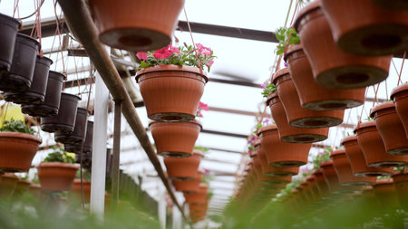A stunning array of hanging flowers fills a greenhouse, showcasing a vibrant mix of colors and textures, bringing beauty to any garden setting with harmony and tranquility.