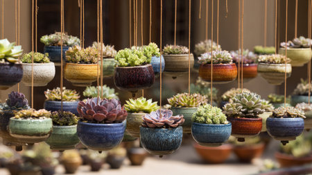 This stunning image captures an array of hanging succulent plants in vibrant pots, creating a beautiful garden display that evokes a sense of calm and natural elegance.