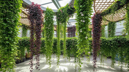 Hanging garden with cascading vines and small tropical flowers in a shaded pergola