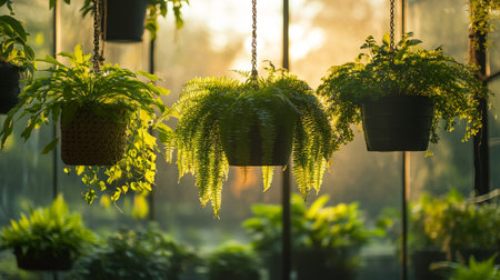 Hanging pots display vibrant green plants at sunset in a serene outdoor space