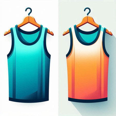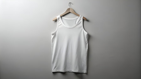 A clean and simple mockup of a white tank top hanging on a wooden hanger against a white background. Perfect for showcasing your designs. branding. or typography.