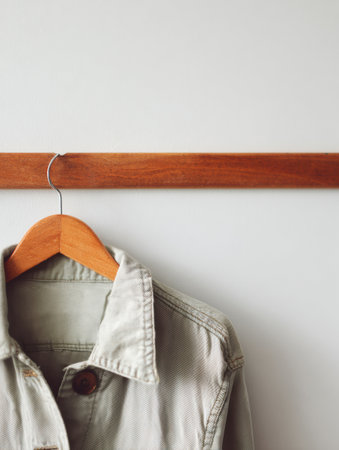 A light spring jacket is placed on a wooden hanger against a plain pastel wall, highlighting the focus on minimal design without distractions.