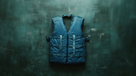 This image features a blue life jacket placed isolated on a dark green textured background. Ideal for themes related to safety, water activities, and outdoor adventures.