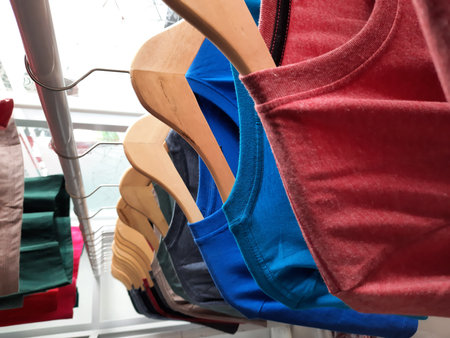 Colorful clothes on a clothing rack shown up close, highlighting a variety of fashionable garments and stylish apparel in a vibrant and neatly arranged retail store display.