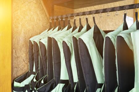 Many of electric EMS fitness training suits being hung inside - electrical shocking technology and science method of workout training