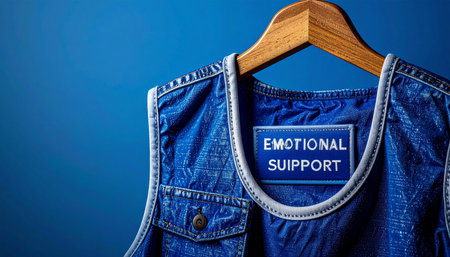 A denim vest with an Emotional Support patch hangs against a blue background, symbolizing the act of wearing ones needs openly. This conceptual image represents mental health awareness, the importance of support systems, and the courage to seek and offer help.