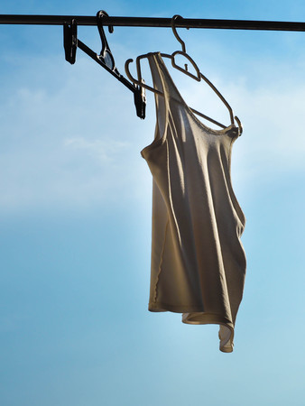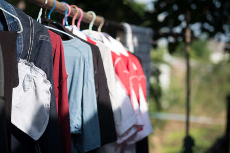 Clothes hanging on clothesline for drying after laundry. Selective focus