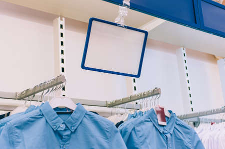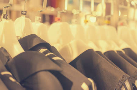 Close up white, blue and black man polo shirts hanging on the plastic hanger at men fashion store with copy space