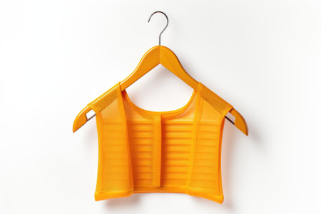 Yellow Shirt Hanging on a Hanger. A vibrant yellow shirt is seen hanging on a sturdy plastic hanger against a plain white background. The shirt is neatly displayed showcasing its bright color.