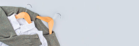Banner with sweater and white shirt - clothes on gray background with copy space. Clothing donations, conscious and environmentally friendly consupmtion - new trends in shopping, slow fashion concept.