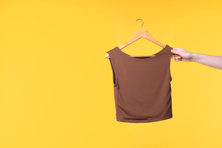 Woman holding hanger with brown tank top on yellow background, closeup. Space for text