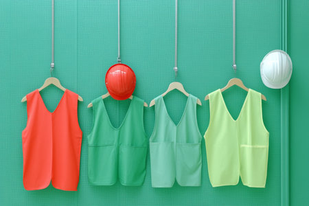 Colorful Safety Vests and Helmets Hanging on Hangers Against Green Wall.
