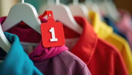Vibrant red plastic number tag on a white hanger, symbolizing a child's first school day. Playful, colorful jackets in the background add energy. Great for educational and parenting content.