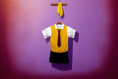 School uniform with backpack near chest of drawers in room. Generative Ai