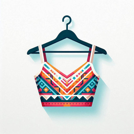 Vibrant clothing hanging on a rack with a botanical theme, interwoven with green leaves for an organic look