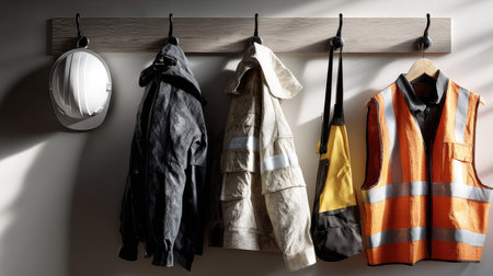 A minimalist view of industrial workwear including jackets and a safety helmet hanging on hooks in a stylish interior, showcasing a blend of functionality and design.