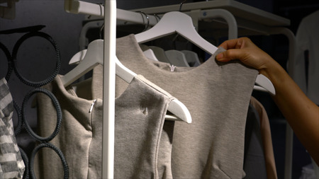 female hands run across a rack of dress in the closet, browsing in a boutique.