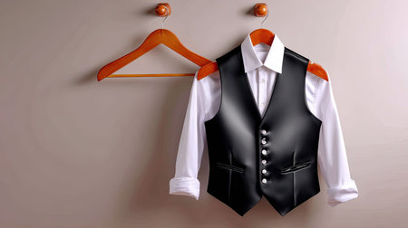 A stylish black vest elegantly drapes from a wooden hanger against a soft neutral wall, complemented by the crisp white shirt sleeves underneath, embodying sophistication.