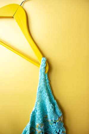 One wooden yellow clothes hanger on a bright yellow background. Turquoise jacket hanging from a hanger. Creative flat lay with copy space. Shopping concept