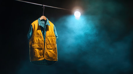 Vibrant vest hanging alone in spotlight with dramatic shadows and dark ambiance
