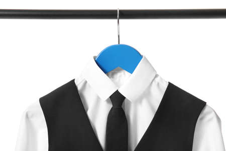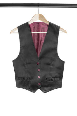 Elegant silk waistcoat on wooden clothes rack isolated over white