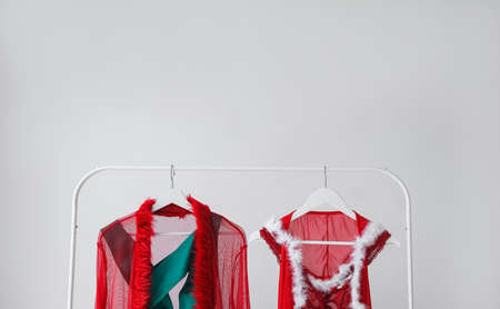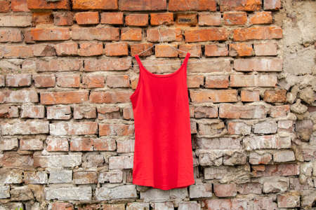 red women summer dress spring hangers on the wall at home on the street, women's clothing fashion