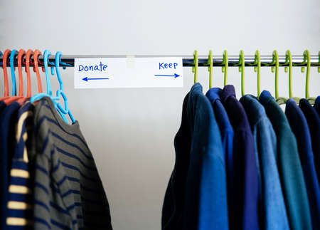 Donation Concept. Separated Used Old Clothes from Wardrobe Rack to Keep and Donate. Focus on Text
