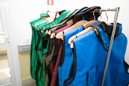 Rack of lead aprons used for x-ray protection in operating room, hospital