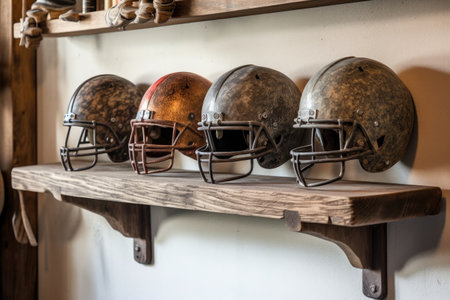 rustic wooden shelf displaying old helmets, created with generative ai