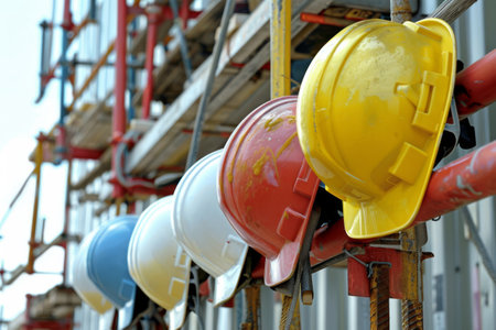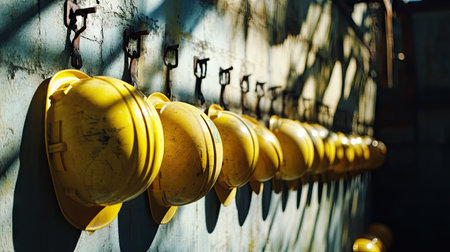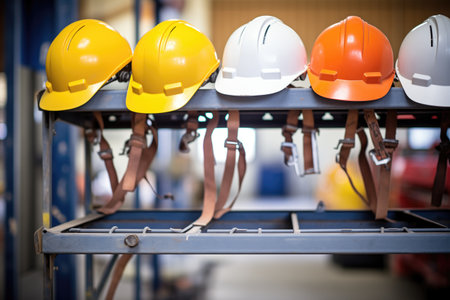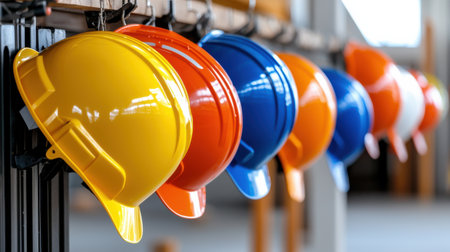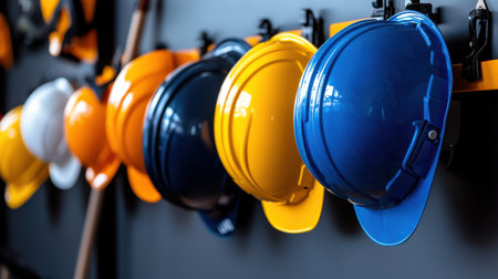 a row of hard hats on hooks in a construction site, created with generative ai