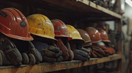 A collection of construction helmets and gloves neatly arranged on a wooden shelf, showcasing essential safety gear vital for workers in industrial and construction environments.