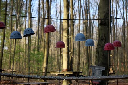 Climbing equipment hanging on the rope at amusement park outdoors