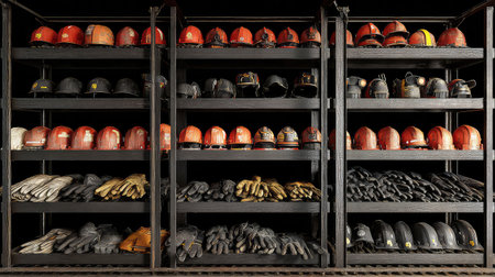 An organized display of safety helmets and gloves stored on industrial shelves. This image emphasizes the importance of proper safety gear in workplace environments.