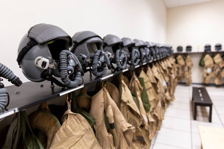 Dressing room of a fighter aircraft (jet fighter) pilot with uniforms and helmets with breathing masks.