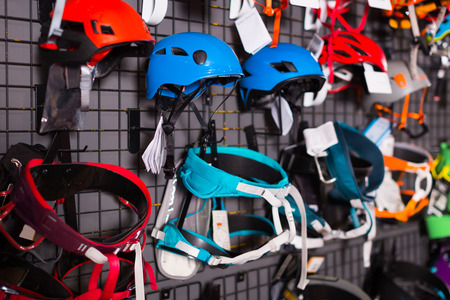 Helmets for mountaineering or for climbing on ropes. Equipment and protection for active sports.