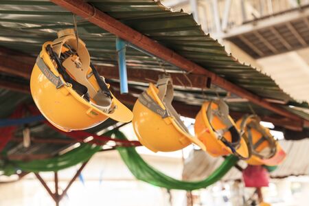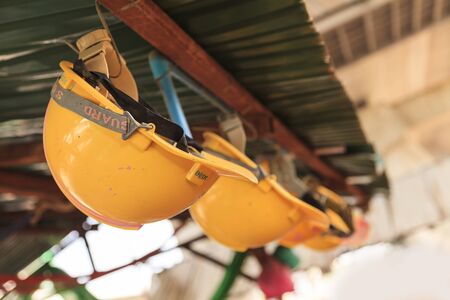 Closeup of hanging hard hat focusing on construction safety concept. Concept Construction Safety, Hard Hat, Closeup Photography