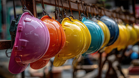 Colorful Hard Hats Hanging in a Construction Site, Showcasing Safety Gear for Workers in Vibrant Colors, Representing Team Spirit and Construction Industry