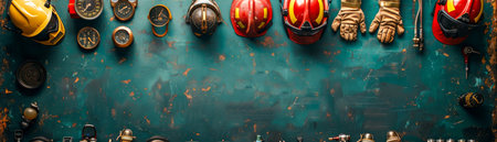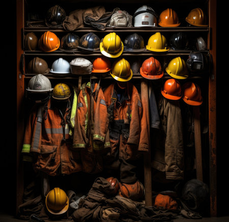 Row of hard hats and safety vests hung on a rack, focus on readiness and safety equipment,
