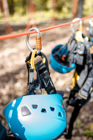 Climbing gear equipment - blue helmet hanging on a board in a rope park